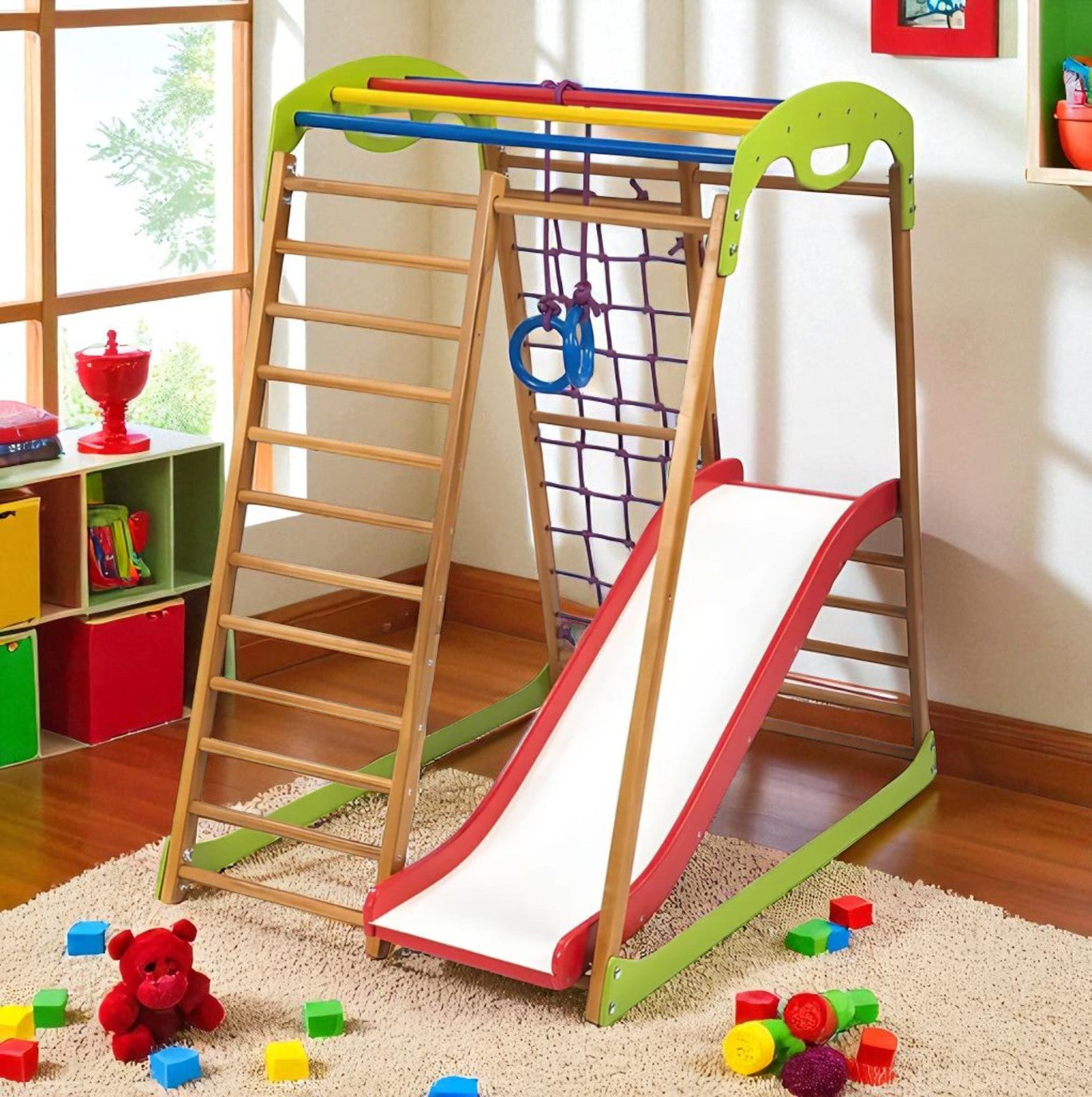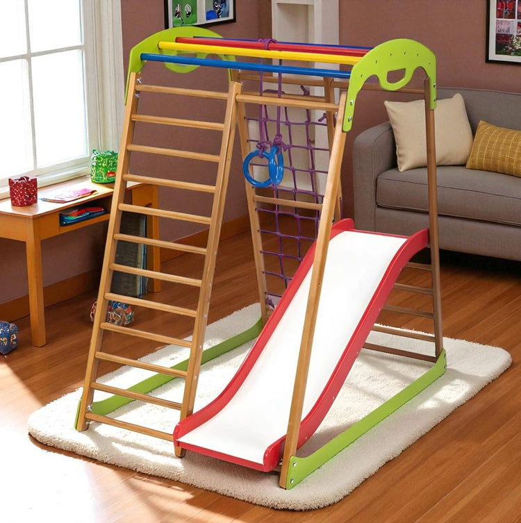 The sports complex is made of wood (beech) with special attention to every detail. You will be satisfied with the quality of the goods we offer. It has a European quality certificate and is completely safe for use by children.