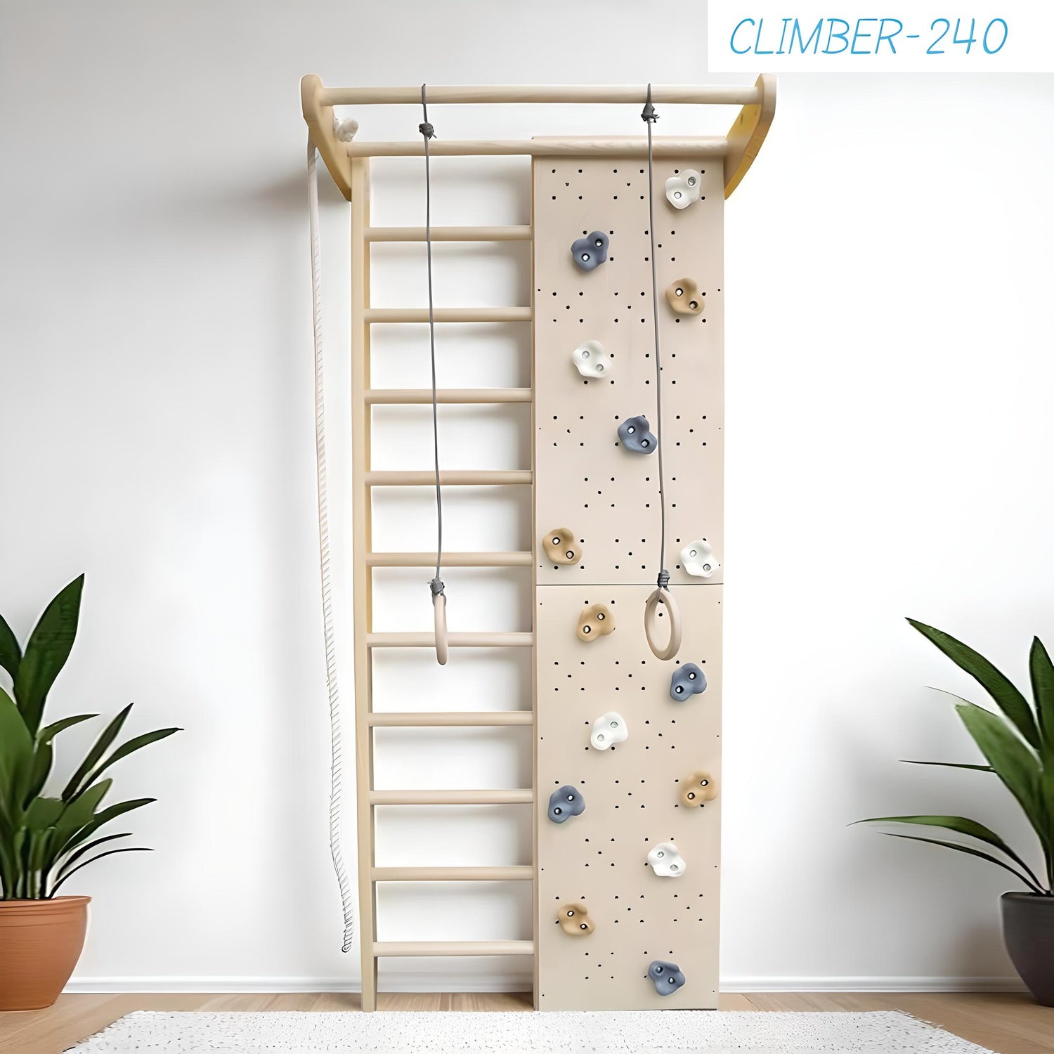 The "Climber - 240" model with huge climbing wall section. This model with a set of gymnastics accessories is an ideal solution for the comprehensive development of children, adolescents and adults weighing up to 100 kg. The Swedish wall bar is one of the most functional sports equipment; it can be used to work out all muscle groups of the abs, arms, legs and spine, and perform stretching exercises.