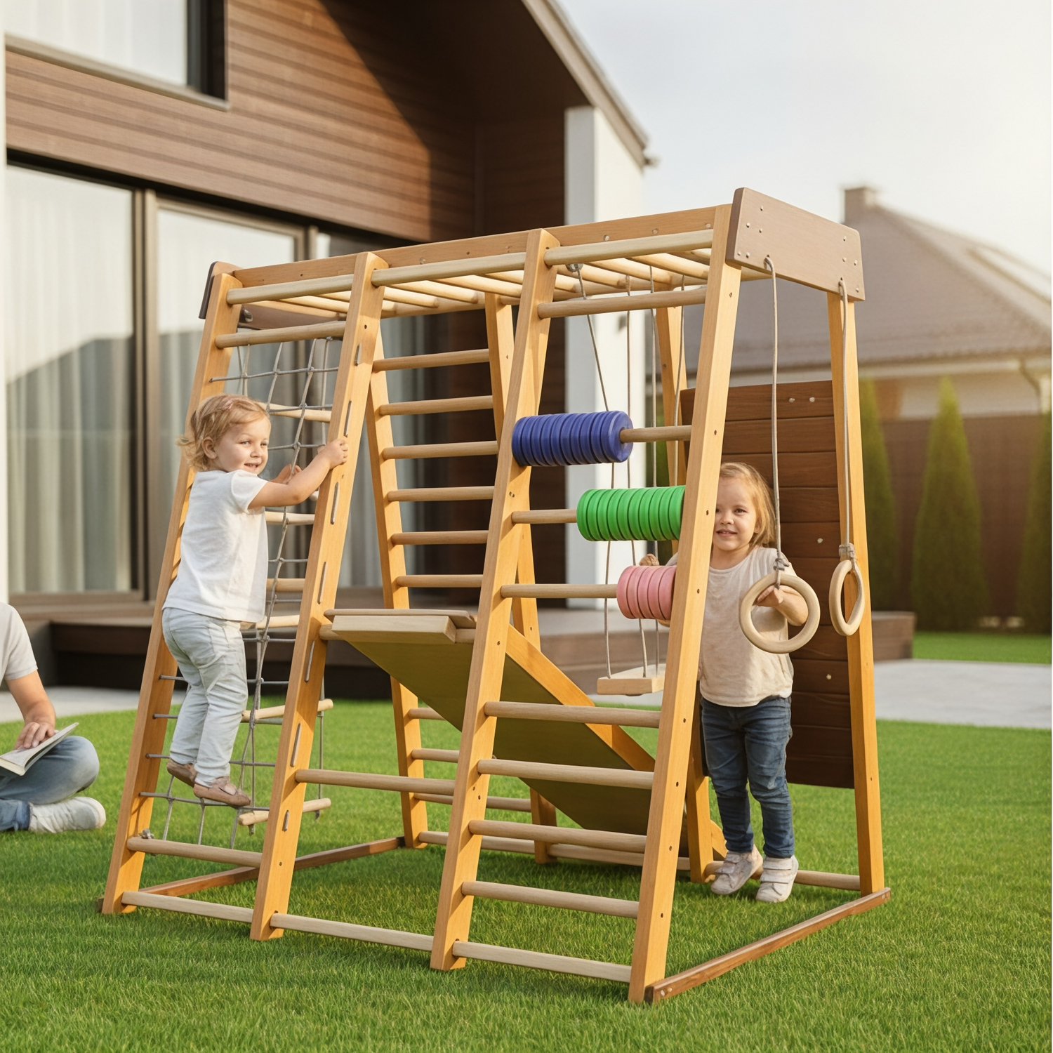 The sports complex is made of wood (beech) with special attention to every detail. You will be satisfied with the quality of the goods we offer. It has a European quality certificate and is completely safe for use by children.