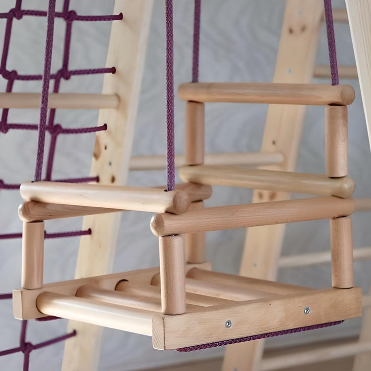Детские качели изготовлены из натурального дерева - бука. Каждый элемент тщательно обработан для их безопасного использования и покрыт водорастворимым лаком. Особая форма спинки будет комфортна для вашего ребенка, а надежные боковые ручки и фиксирующаяся передняя перекладина обеспечат безопасность.