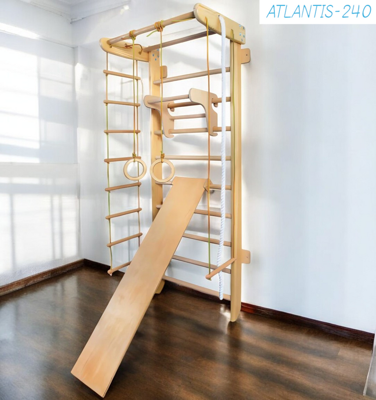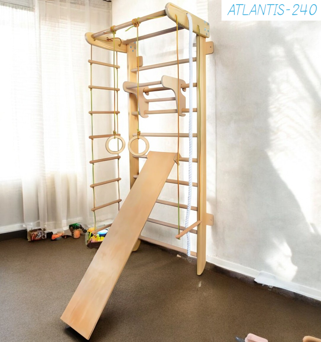 Примиальная модель шведской стенки и уникальный спортивный комплекс для всей семьи "Атлантида-240". Подходит для дома и улицы. Особенностью этой модели является адаптивный к любому росту навесной турник.