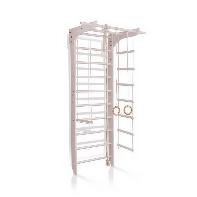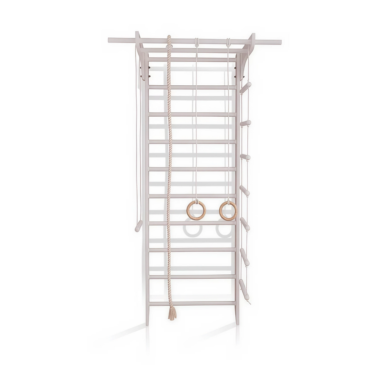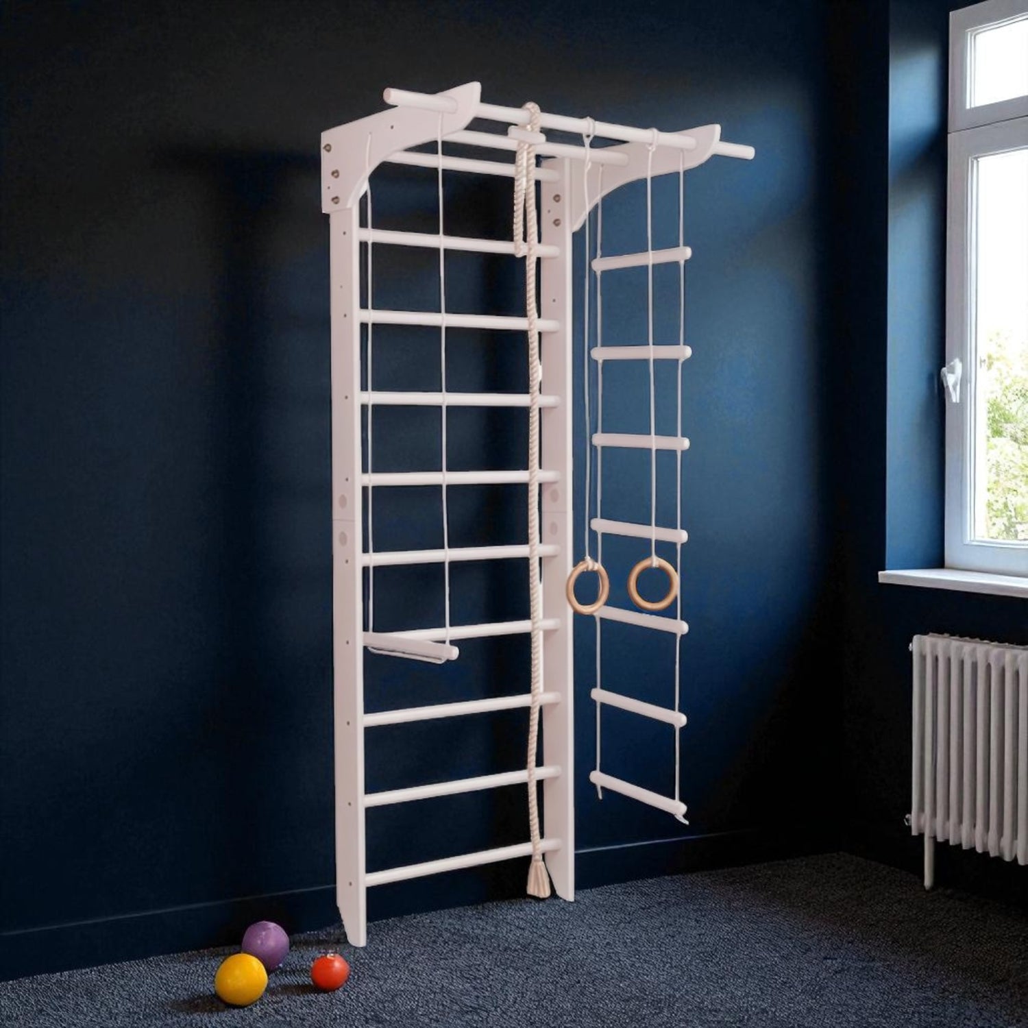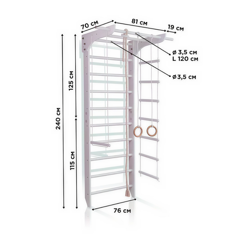 Спортивный комплекс выполнен из натуральных твердых пород дерева: бука и сосны. Его можно использовать для гимнастики, силовых тренировок, фитнеса, физиотерапии как с раннего возраста так и всей семьей. Нагрузка на турник до 100 кг.